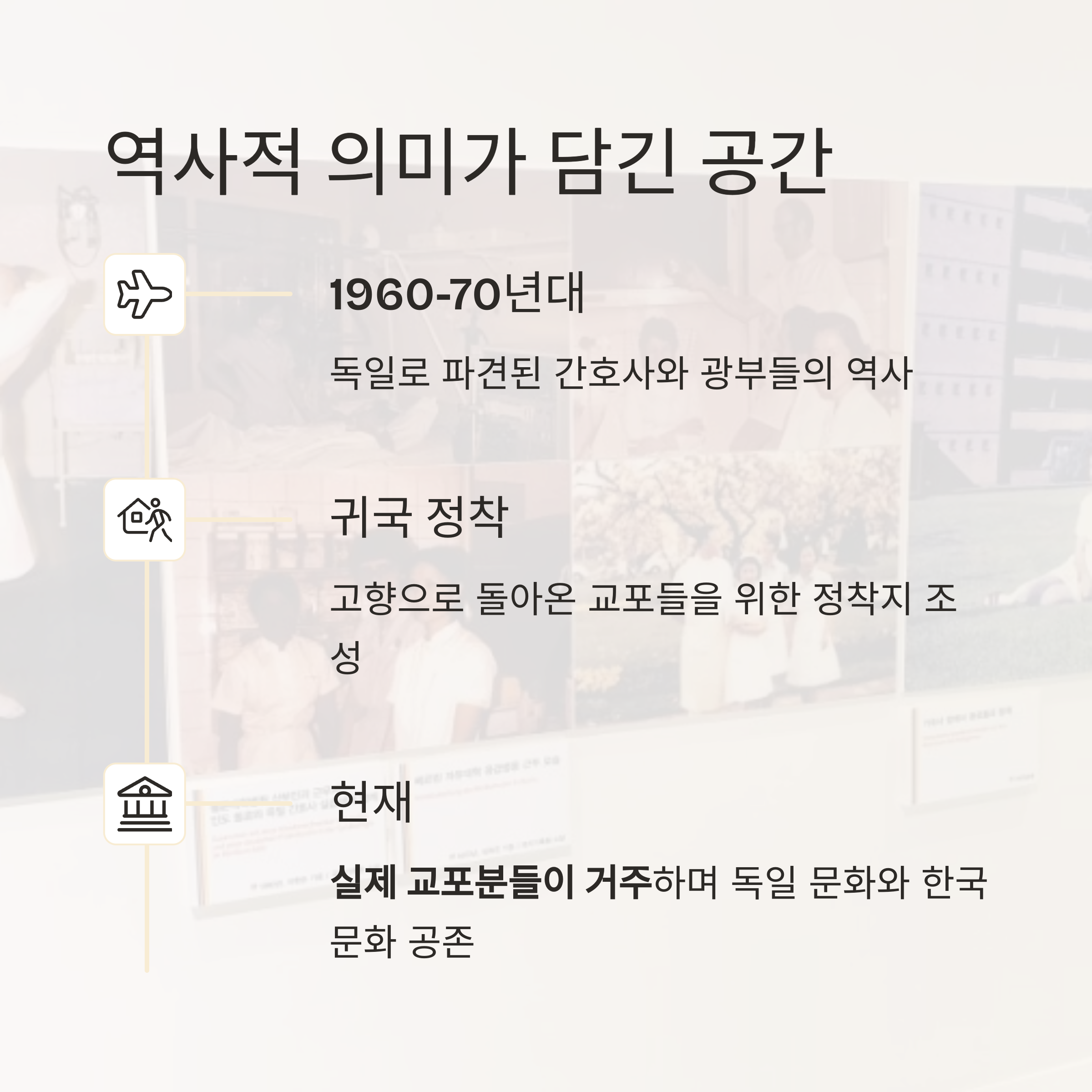 실제 교포분들이 거주하고 있으며, 그들의 생활과 독일 문화가 자연스럽게 어우러져 있어