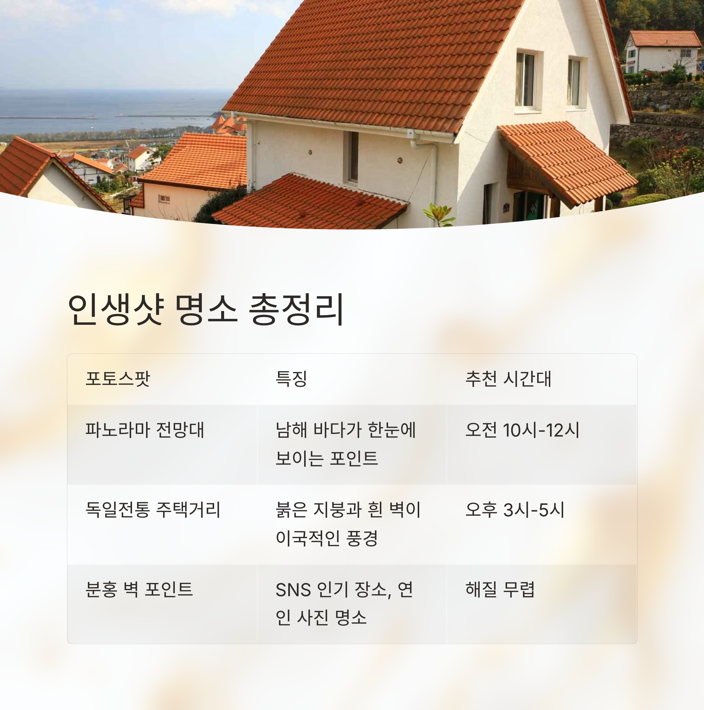 | 독일전통 주택거리 | 붉은 지붕과 흰 벽이 이국적인 풍경 제공 | 오후 3시~5시 |