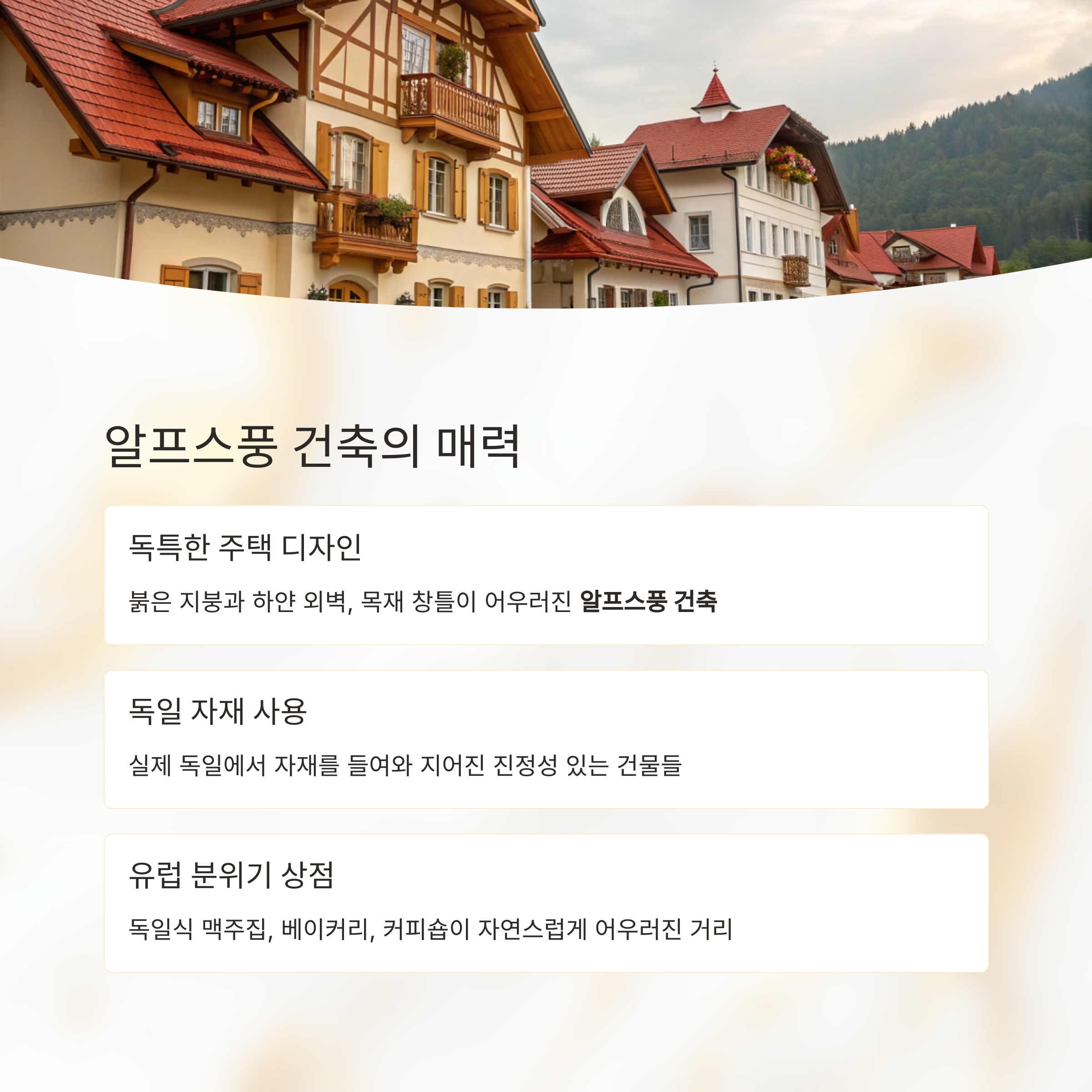 독일전통 주택거리 | 붉은 지붕과 흰 벽이 이국적인 풍경 제공 | 오후 3시~5시 |