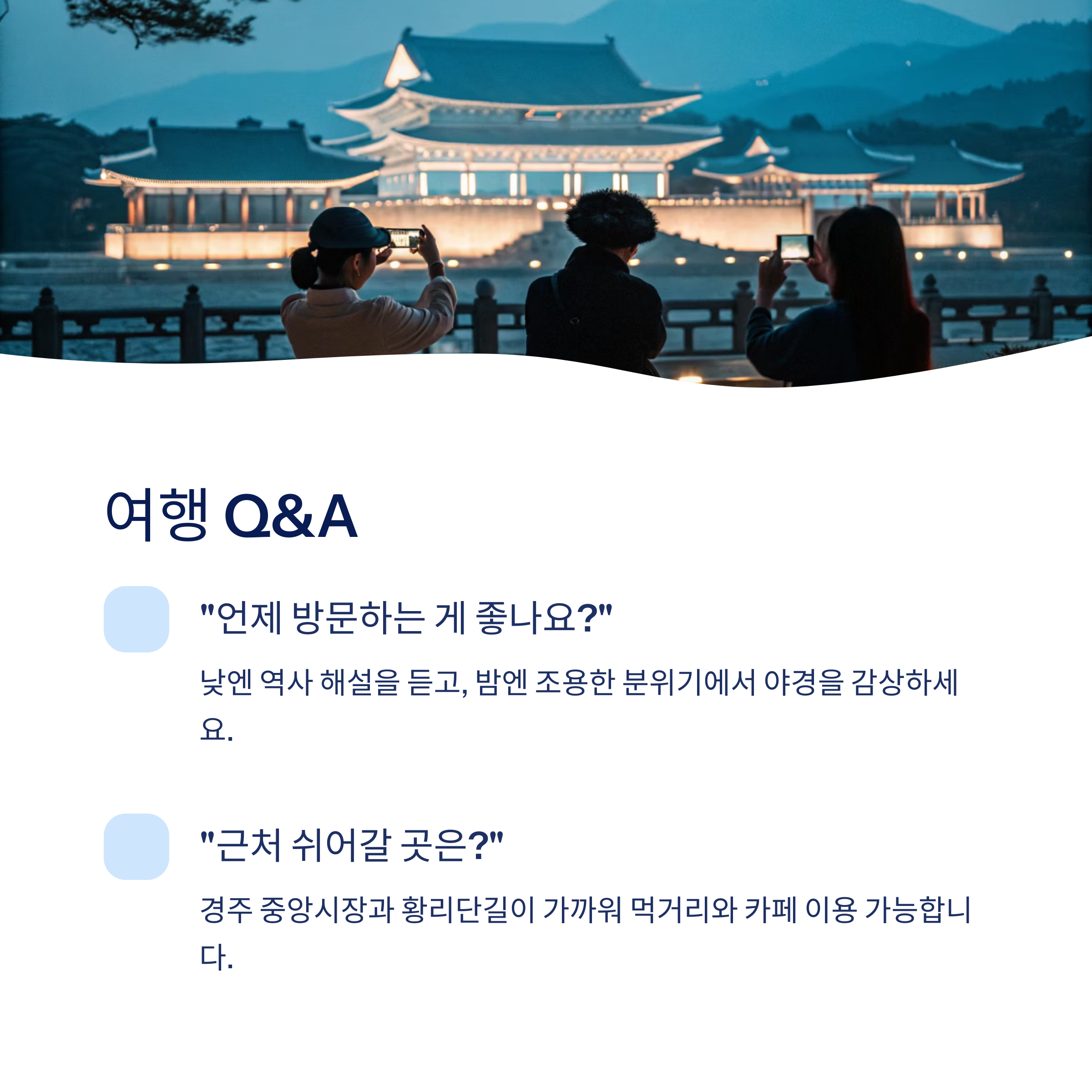"낮엔 역사 해설을 듣고, 밤엔 조용한 분위기에서 야경을 감상하시면 좋아요."