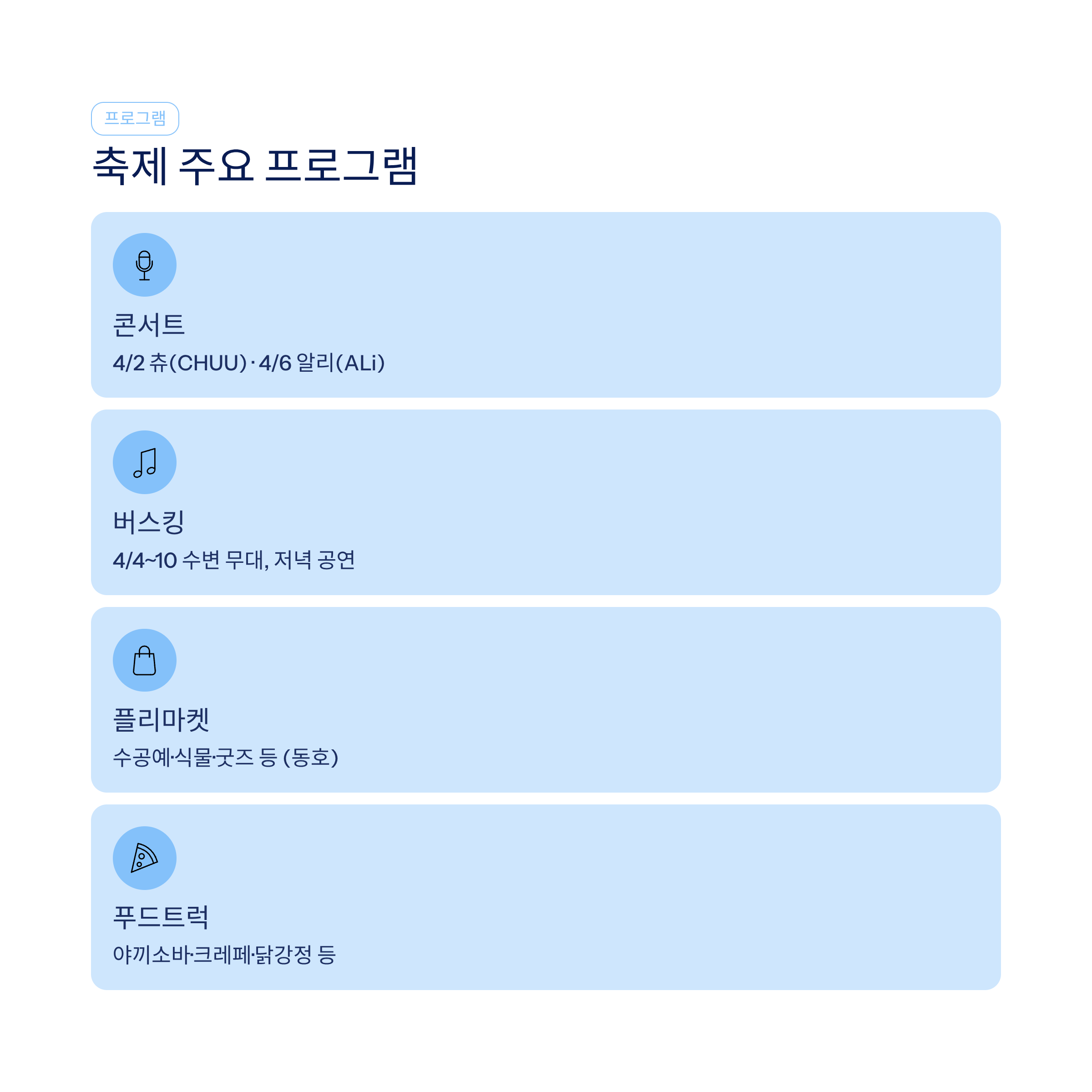- 버스킹 공연 (4/4~10): 싱어송라이터·재즈·인디 밴드 등 수변 무대에서 저녁 시간 공연